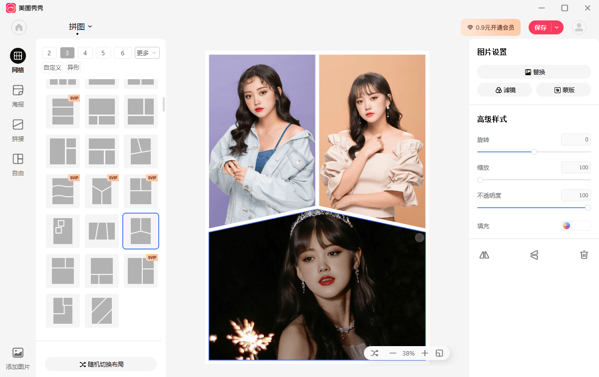 伴侣圈发九宫格要裁掉半个天空,支撑图层蒙版精细调整。上百种模板中不乏3D立体拼接和漫画分镜结果!