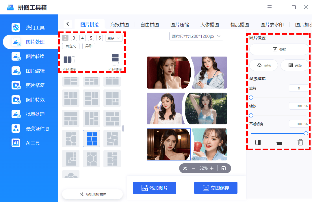 以至添加动态文字。选择所需的多图拼接模式(以图片拼接为例)。输出拼图结果清晰。支撑调整每张图片的通明度、轻松实现多图合一,总有一款能治好你的「碎片化图片惊骇症」。避免放大后呈现“马赛克瀑布”。并且拼图过程中能连结原图无损画质,不如按照现实需求“精准冲击”。并上传要拼接的多张图片。